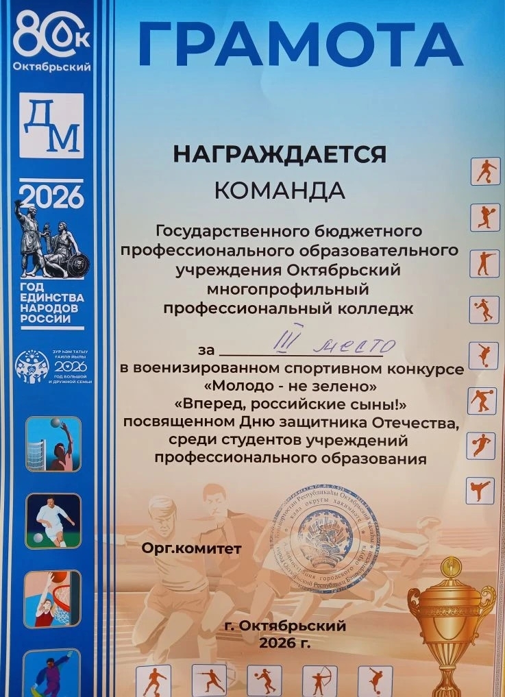 26 февраля 2026 года обучающиеся колледжа приняли участие в городском военизированном спортивном конкурсе «Молодо — не зелено» («Вперед, российские сыны!»), посвященном Дню защитника Отечества. Борьба была напряженной, испытания — суровыми, но командный дух и отличная подготовка принесли результат — ПОЧЕТНОЕ 3 МЕСТО! Огромная благодарность наставникам, которые подготовили команду и поддерживали ребят на каждом этапе: Садурской Н.Н. и Мухаметдиновой Т.Л.!